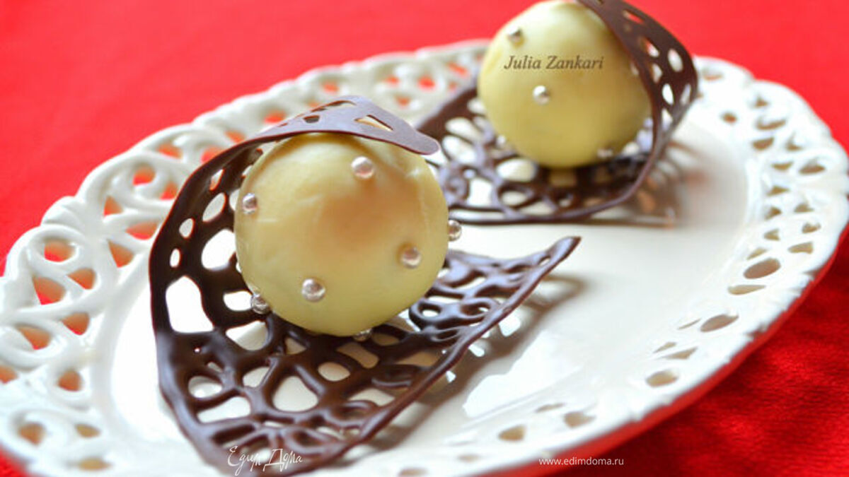 Скатываем из белого шоколада шарики и расплющив немного кладем в серединку шарик темного шоколада, скатываем в ровный шар. Оставляем на несколько часов в холодильнике.