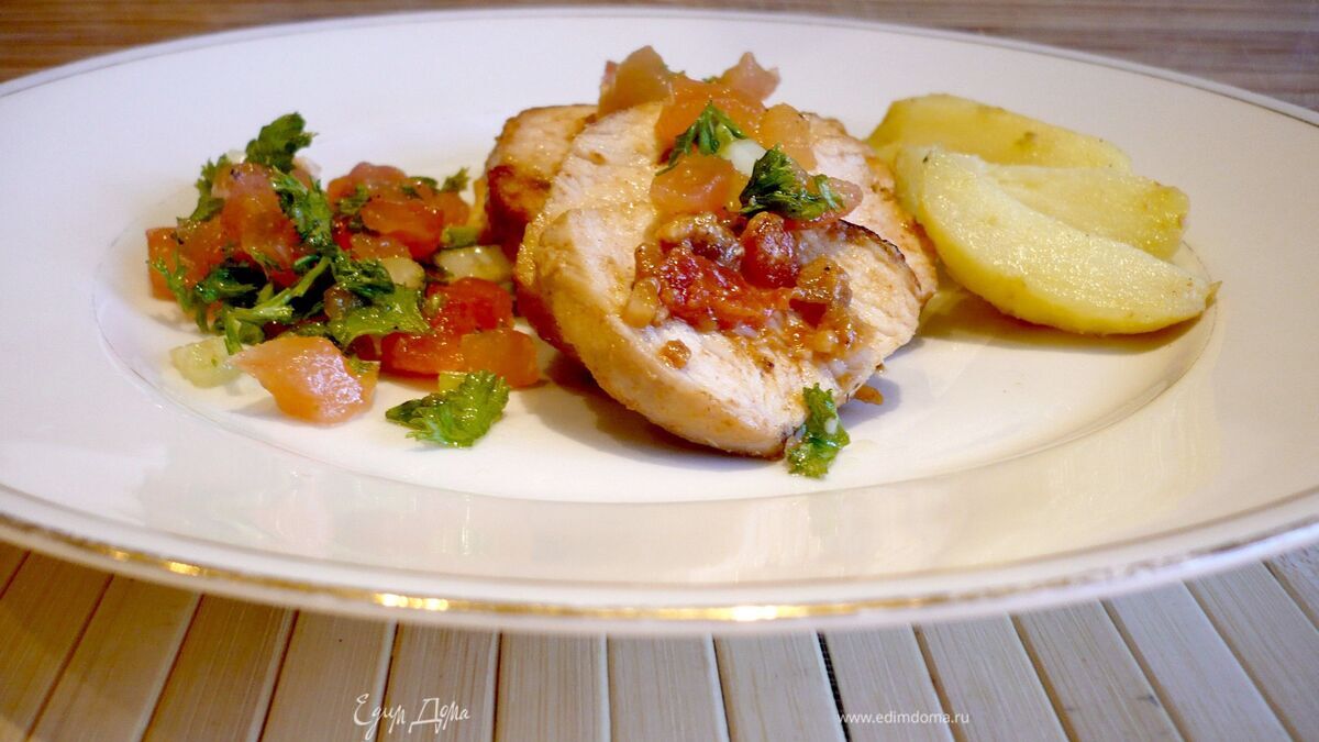 Очень нежное куриное мясо, сочное, с чудесной начинкой, обладающей насыщенной и тем не менее гармонично сочетающейся с кислинкой томатов фруктовой нотой. Что интересно, в одном из последних моих рецептов я негодовала из-за слишком маленького размера половинок филе куриной грудки, но благодаря этому рецепту поняла, что именно такими, совсем небольшими, т.е. весом примерно в 130 грамм, они и должны быть, если по рецепту их предстоит обжаривать, и совсем не важно, что с наполнением придется повозиться, гораздо важнее то, что мясо за считанные минуты прожарится, а значит сюрприза с краснеющей серединкой при разрезании филе не предвидится. Именно этот сюрприз ждал меня на этот раз! Пришлось разрезанное филе обжаривать дополнительно. Но несмотря на это разочарование блюдо нам всем очень понравилось, обязательно приготовьте к нему освежающий салат с томатами и сельдереем, он прекрасно дополняет фруктовую кислинку куриного филе! Да, и по рецепту в начинку добавляется паста харисса, я ее приобрела и очень радовалась, что наконец-то смогу попробовать, она мне на вкус очень понравилась, но я не решилась добавить ее, уж больно она острая для малышей, а Вы вполне можете не готовить заправку из томатной пасты, как это решила сделать я, а просто взять 1 чайную ложку этой безумно вкусной, но очень острой пасты, или заменить ее на аджику. Итак, приступим...