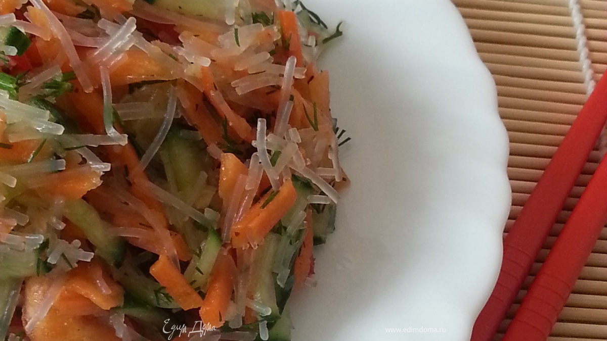 Рецепт этого салата мы когда то давно прочитали на упаковке "Заправка для фунчозы по-корейски" (все те же ингредиенты, исключая огурец, а морковь в свежем виде, перемешивались и заправлялись данной заправкой), но в составе было слишком много "Е" и содержался уксус, поэтому было решено сделать морковь по своему любимому рецепту, добавить овощи и огурец - и вот, более полезный, но не менее вкусный вариант готов!!!