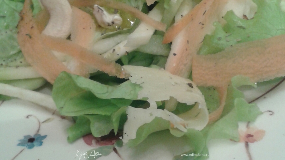 Полейте салат заправкой и осторожно перемешайте. Посыпьте орешками, сыром пармезан и сразу подавайте.