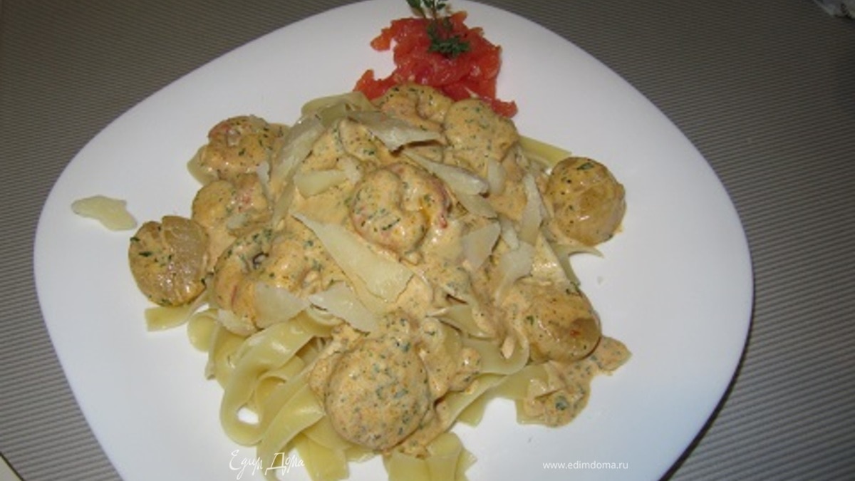 Готовую пасту смешать с соусом на сковороде или выложить на тарелку отдельно. Украсить пармезаном и слабосоленым лососем по желанию. Приятного аппетита.