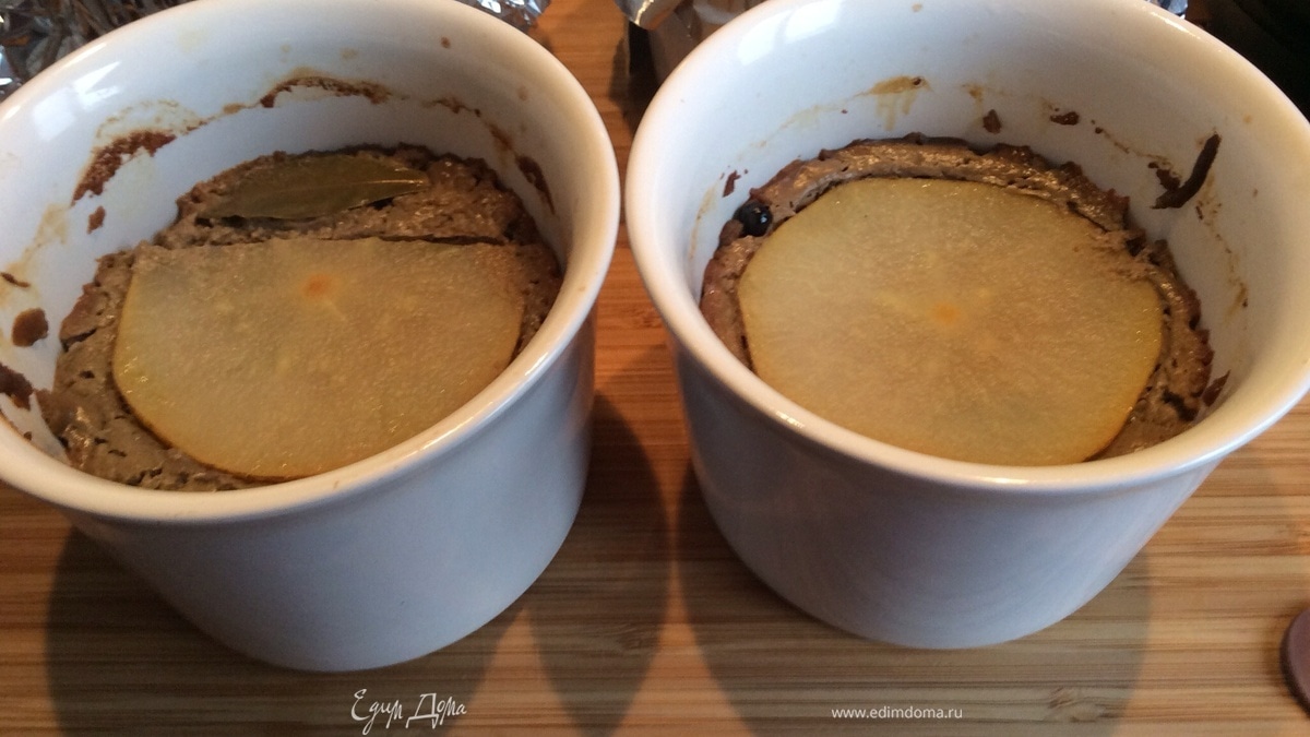 Керамические формы смазать сливочным маслом, выложить печеночную массу, сверху положить листик лаврового листа и кружок груши толщиной 0,5 см , слегка придавить.
