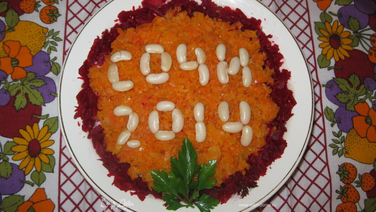 Фасоль на ночь замачиваем в воде. Варим. Отвариваем свеклу и морковь. Морковь и свеклу измельчаем. И выкладываем верхний слой. Фасолью пишем: СОЧИ - 2014. Приятного аппетита!