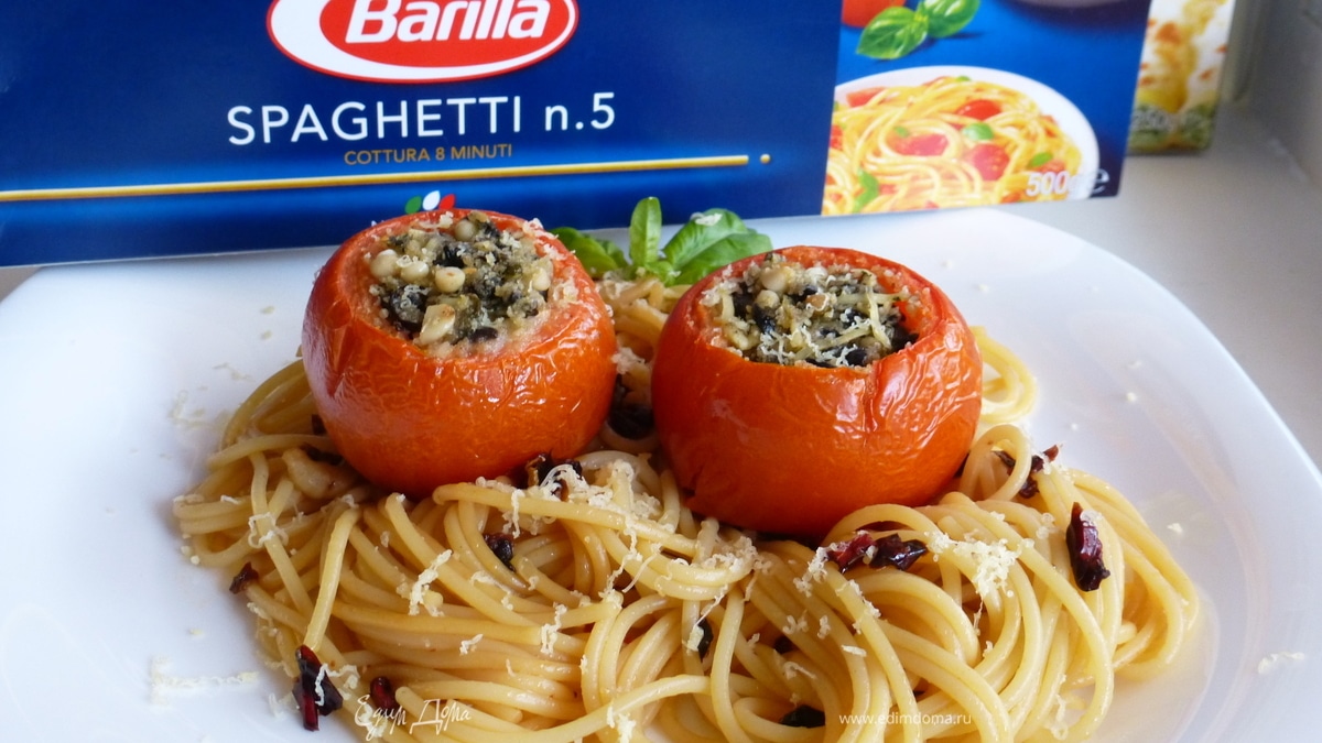 Спешу Вас познакомить с интересным вариантом пасты. Печеные помидоры с ароматной яркой начинкой, спагетти с чесночным ароматом, ну очень вкусно! Угощайтесь!