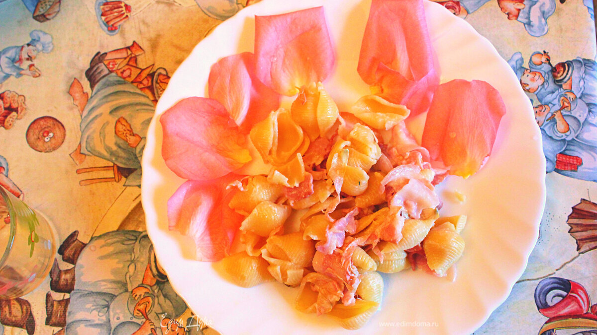 - Шаг 1Отварить конкилье согласно инструкции, полить оливковым маслом. Протереть влажной салфеточкой лепестки роз и порезать их на мелкие кусочки. Всыпать в соус. Полить им готовые макаронные изделия.