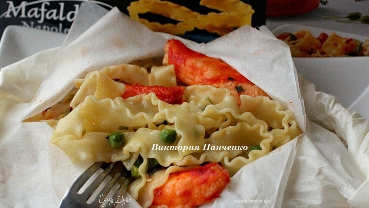 Мафальдине с камчатским крабом и зеленым горошком, запеченные в пергаменте