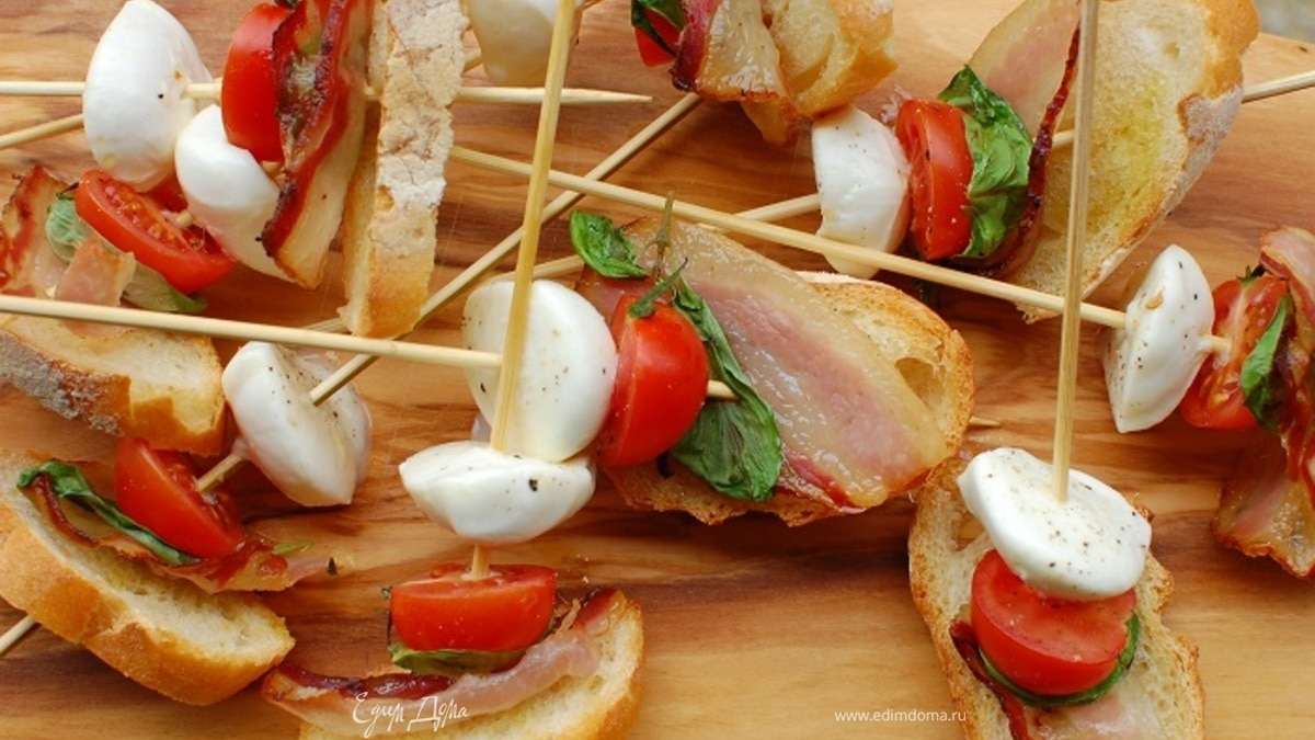 На каждую деревянную шпажку нанизать кусочек моцареллы, половинку помидора, лист базилика и кусочек хлеба с салом. - Шаг 6
