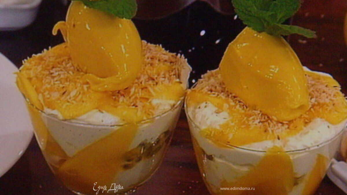 Затем выкладываем слоями: немного бисквита савоярди, несколько капель лимончелло( можно заменить на лимонад: воду+сахар+сок лимона), манговое пюре и слой крема. Так повторяем два раза до полного заполнения бокала.