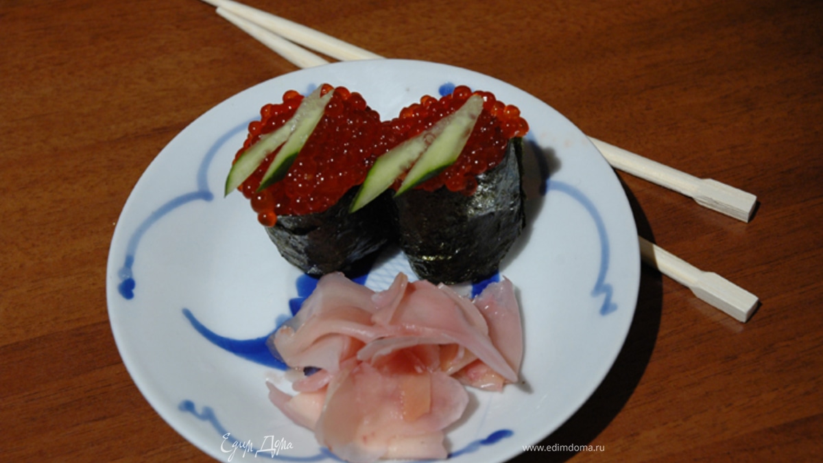 Поставить ролл на ровную поверхность, выложить сверху лососевую икру, добавить немного васаби. - Шаг 6