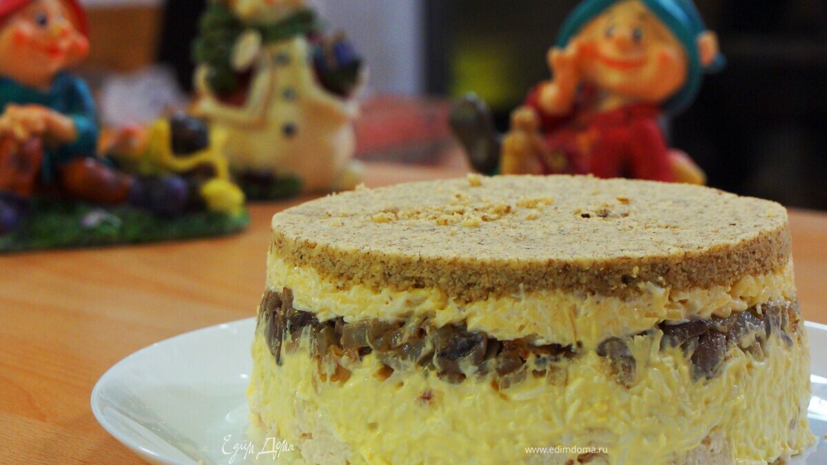 Выкладывать слоями (1. картофель; 2. филе; 3. яйца; 4. грибы, лук; 5. сыр, чеснок; 6. орехи), добавляя немного майонеза к каждому ингредиенту. Чтобы все хорошо держалось я взяла тортовое кольцо диаметром 15 см. Готово. Приятного аппетита!
