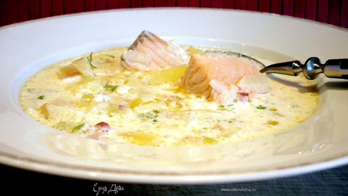 Готовя то или иное блюдо, мы часто и не осознаем, что наша находчивость позволяет выбранным нами ингредиентам реализовать вторую составляющую мушкетерского девиза, а именно: все — за одного! Т.е. если нам не хватает чего-то, мы начинаем искать замену и нередко заменяем один недостающий элемент сразу несколькими компонентами. Конечно, сложнее представить в кулинарной практике воплощение в жизнь первой части девиза - «один — за всех», - но, с другой стороны, сколько чудных блюд можно приготовить с одним основным ингредиентом, например, с картофелем или рисом! Небольшое сопровождение в виде сливочного масла и молока — и, пожалуйста, на столе прекрасный гарнир или полноценное блюдо! Так вот сегодня я хочу познакомить вас с одним ну очень вкусным вариантом рыбного супа, для приготовления которого по оригинальному американскому рецепту (новоанглийский клэм-чаудер) мне потребовался бы рыбный бульон и моллюски! Но, на мой взгляд, семга вместо моллюсков и целый ряд ярких по своим вкусовым качествам овощей вместо рыбного бульона удачно заменили мне два этих ингредиента! Вообще сегодня я открыла для себя абсолютно новые возможности для приготовления совершенно потрясающей рыбной похлебки с добавлением молока и сливок! Важно только при повторном разогревании не доводить суп до кипения, так как он может свернуться. Угощайтесь!