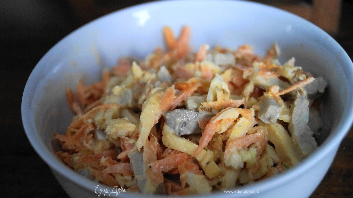 Отварное мясо и яичные блинчики порезать тонкой соломкой. Морковь сложить в салатницу, посолить, поперчить и добавить карри. Дать морковке немного постоять, пропитаться специями.