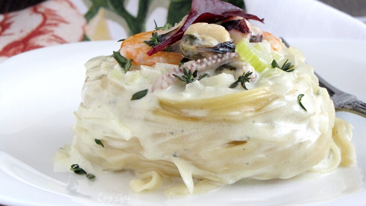 "Гнезда" с морским ассорти под сметанно-сырным соусом и ароматом тимьяна понравятся любителям морепродуктов и голоубого сыра!