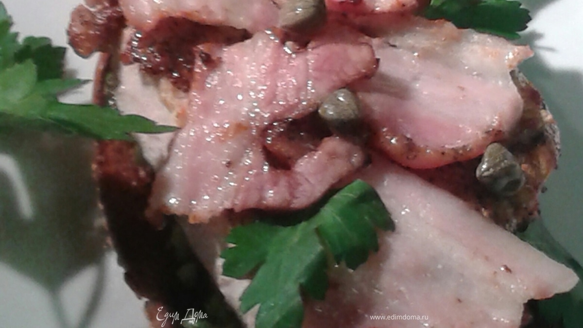 В заключении на курицу кладем обжаренный бекон, украшаем зеленью и каперсами. Подавать сразу!