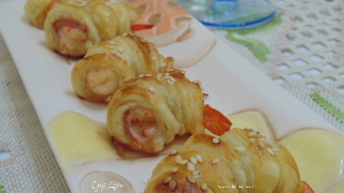 Тесто нарезать тонкими полосками, обернуть каждую креветку полоской теста. Желток взбить, добавить молоко. Каждую креветку смазать желтком, посыпать кунжутом. Запекать при температуре 200 гр С 15-20 минут до зарумянивания. - Шаг 3