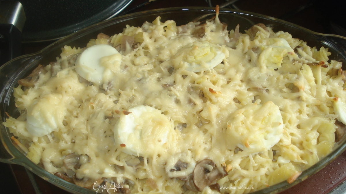 - Шаг 11. Макароны отварить и обдать холодной водой. 2. Яйца сварить вкрутую. 3. Грибы нарезать пластинками. Сыр потереть на мелкой терке. 4. Духовку нагреть до 200 С. 2 яйца порубить, остальные нарезать поперек кружочками. 5. Репчатый лук нарезать кубиками. В сотейнике распустить сливочное масло и пассеровать в нем лук. Затем добавить шампиньоны и потушить вместе. Влить бульон и довести до кипения. Подмешать сметану. Получившийся соус посолить и поперчить. 6. Макароны смешать с соусом из грибов и 1/2 сыра. Затем подмешать рубленый яйца. Посуду смазать жиром и выложить смесь. Сверху положить кружки яиц и сыр. Лапшевник запекать в духовке в течение 20 минут.
