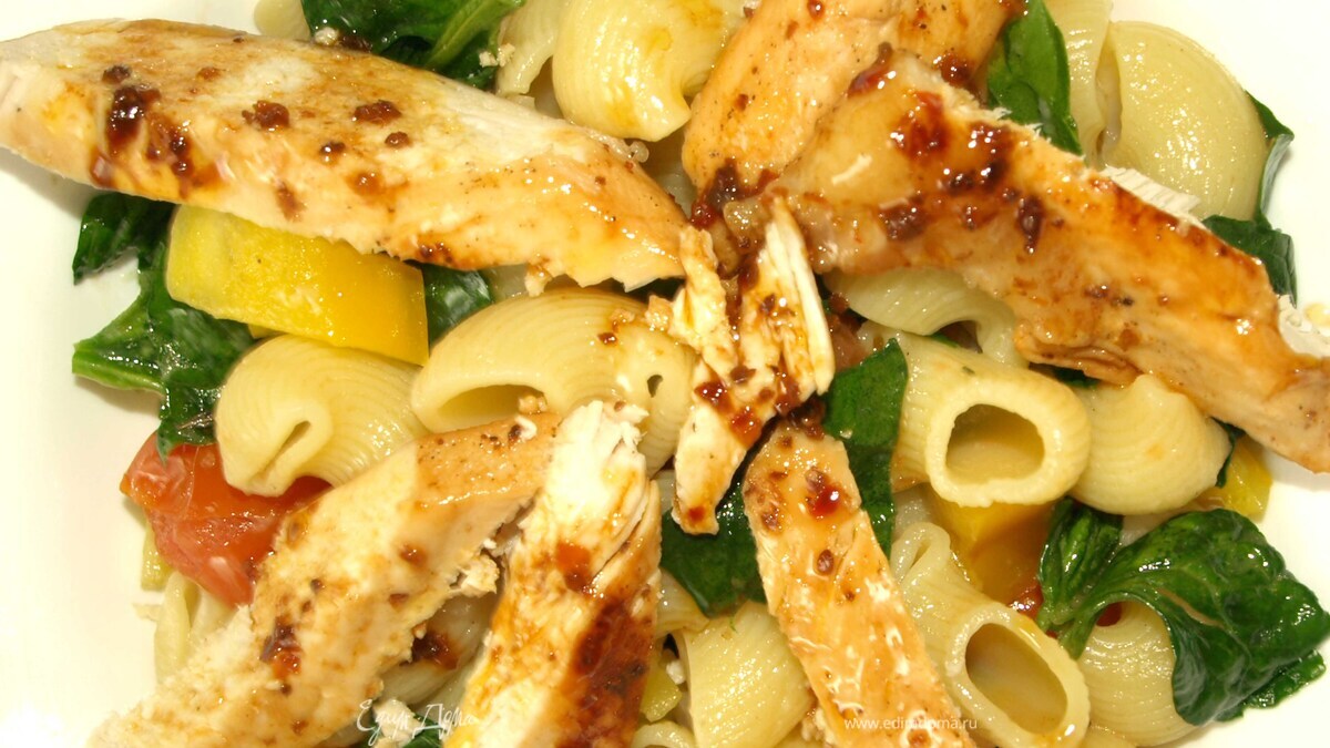Готовую пасту смешать с шпинатом, помидорами, перцем и добавить сок, который выделился после запекания помидор. Все перемешать. Разложить порционно. - Шаг 7