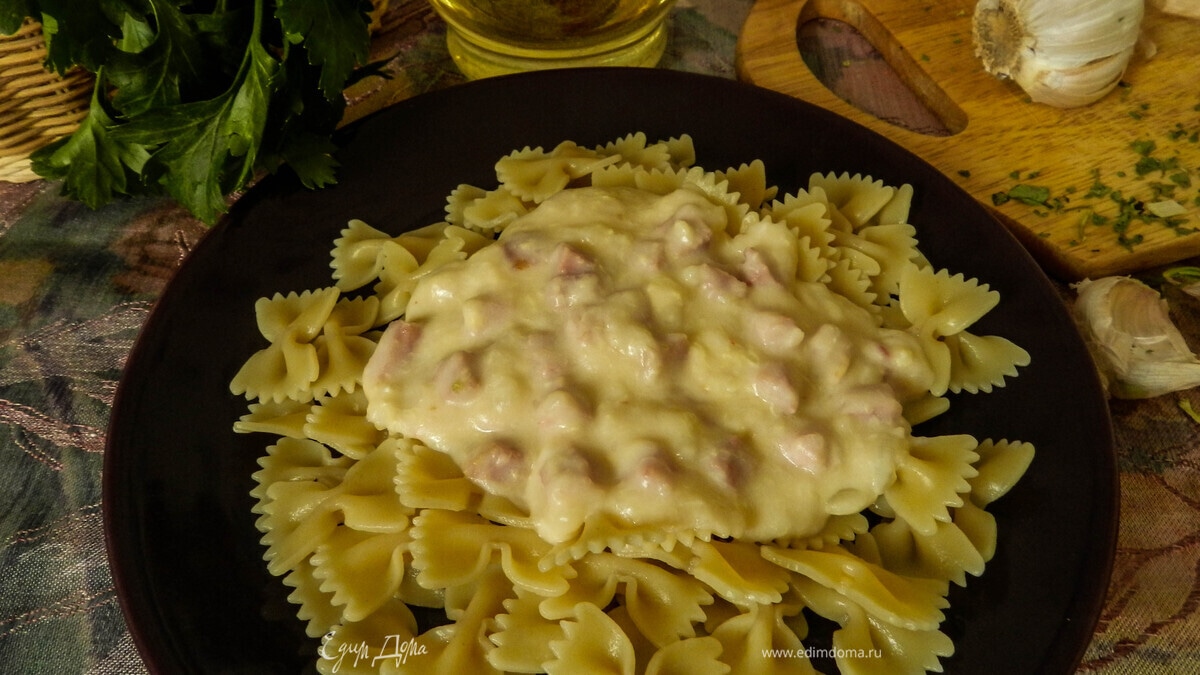 Подавать с макаронами бантиками, при желании можно украсить зеленью.