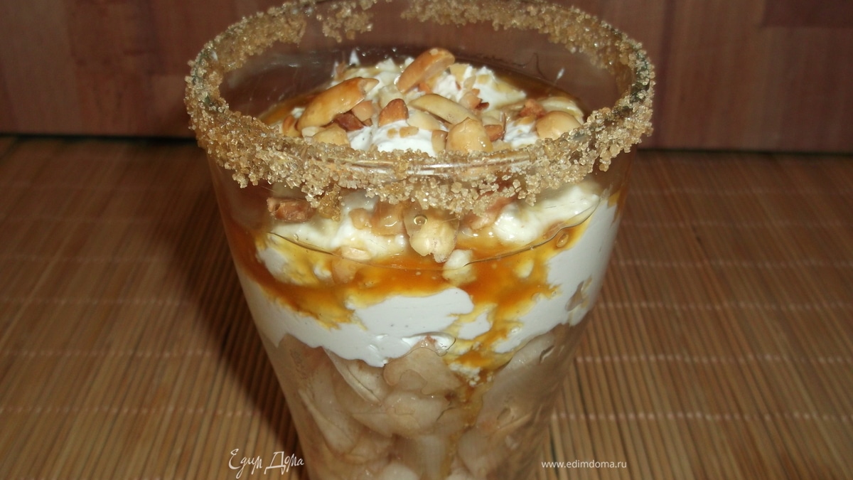 Края стаканчика в котором подаём десерт, промазываем лимоном и прокручиваем в сахаре (у меня коричневый) вообще по рецепту надо прокрутить в арахисовой крошке, но она у меня не прилипла, пришлось воспользоваться сахаром. Выкладываем грушу, сверху выдавливаем мусс, присыпаем орешками и половинками арахиса, и и чайной ложечкой, аккуратно по краю поливаем мёдом. Готово! Приятного аппетита!