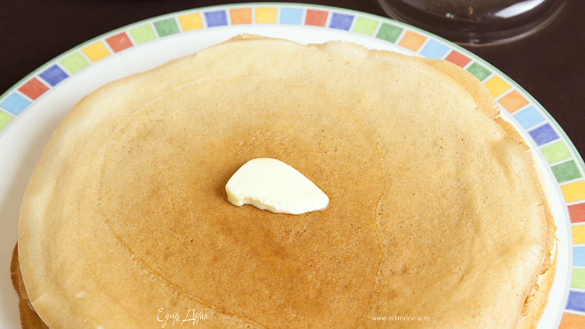 Перед выпеканием первого блина смазать сковороду растительным маслом. На разогретую сковороду выливать половником тесто и распределять его круговыми движениями. Удобно печь блины сразу на двух сковородах — получается очень быстро! Выпекать тоненькие блинчики на среднем огне, переворачивать лопаточкой. Выкладывать на тарелку, смазывая каждый блинчик сливочным маслом. Подавать горячими.