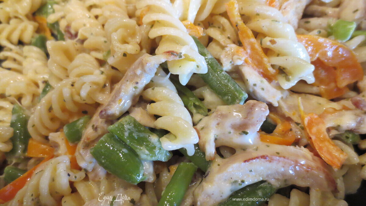 - Шаг 7Пасту выложить в сотейник с курицей и овощами, все хорошенько перемешать и немедленно подавать на стол. Сверху можно посыпать мелко натертым пармезаном.