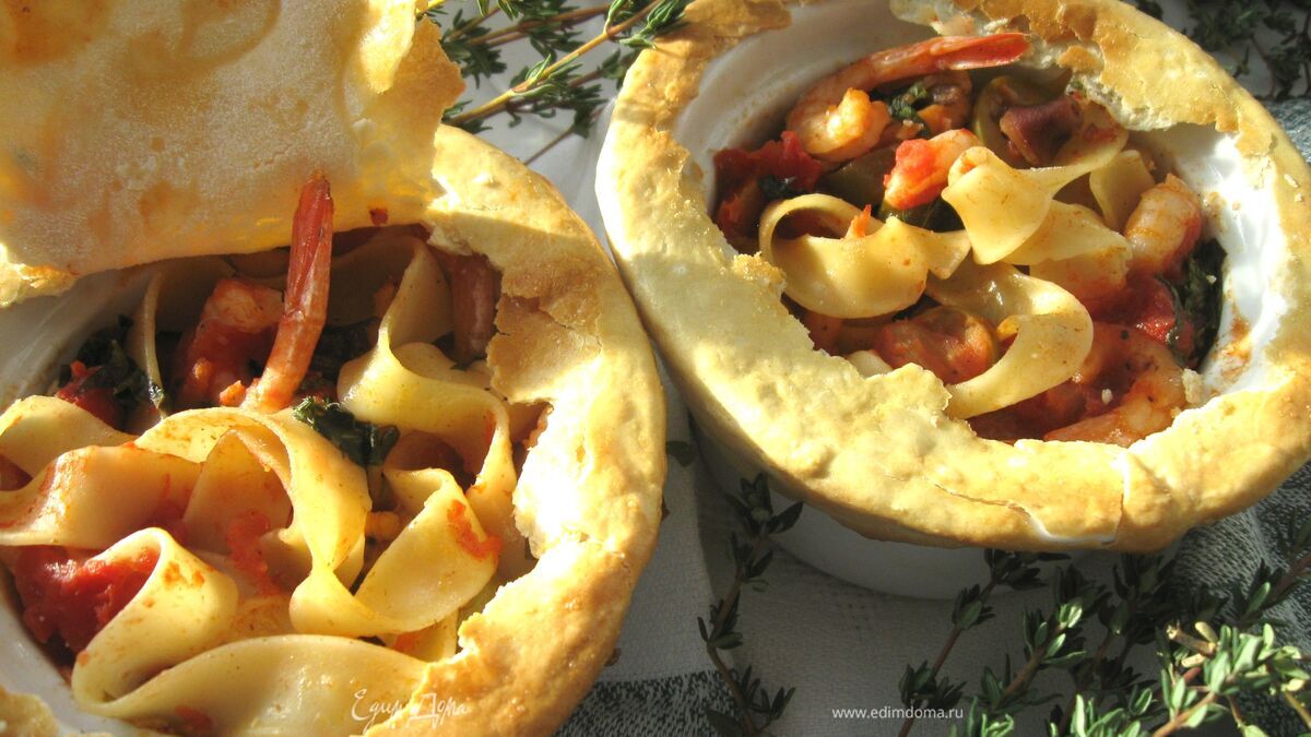 Морепродукты (коктейль, креветки) потушить немного на оливковом масле с добавлением вина, чеснока, соли и перца. Добавить пассерованные томаты и измельченные помидоры, которые предварительно надо на 3 минуты опустить в кипяток, снять шкурку. Через 3 – 4 минуты снять с огня. Пасту Fettuccine отваривать в кипящей подсоленой воде 5 минут. Слить воду с помощью дуршлага.