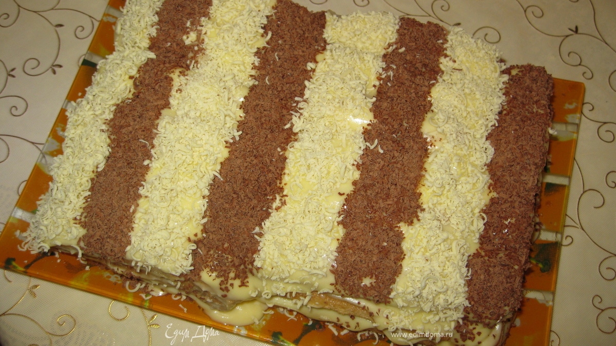 Затем следующий слой пропитанного печенья, слой крема и тертого шоколада. У меня получился 4-х этажный тортик, размером 14*24 см. - Шаг 7