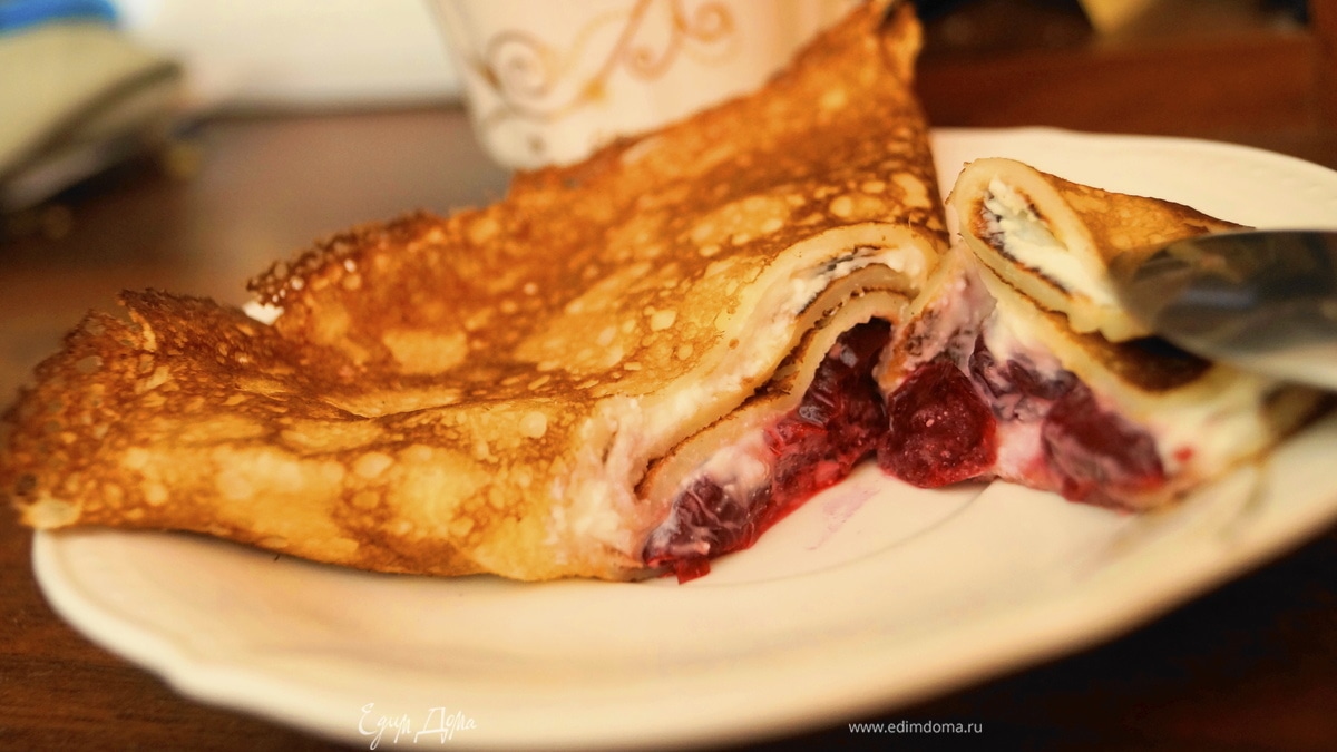 Блин смазать небольшим слоем творожной массы и положить несколько вишен.