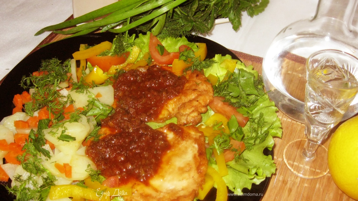 Гарнир тоже приготовился. Осталось выложить на тарелку, полить горячие отбивные соусом, посыпать зеленью, ну и добавить немного овощей. Несмотря на то, что жарил я быстро, мясо хорошо прожарилось и покрылось тонкой хрустящей корочкой, которое впитало в себя ароматы из масла. Соус слегка остыл и загустел. На вкус получился кисло-сладким. Необычное, но приятное на вкус сочетание. Я почти ничего не солил. В панировке достаточно соли из сыра, а в соусе из огурцов. Несмотря на то, что я люблю все пересаливать, мне понравилось и к солонке я не притронулся.