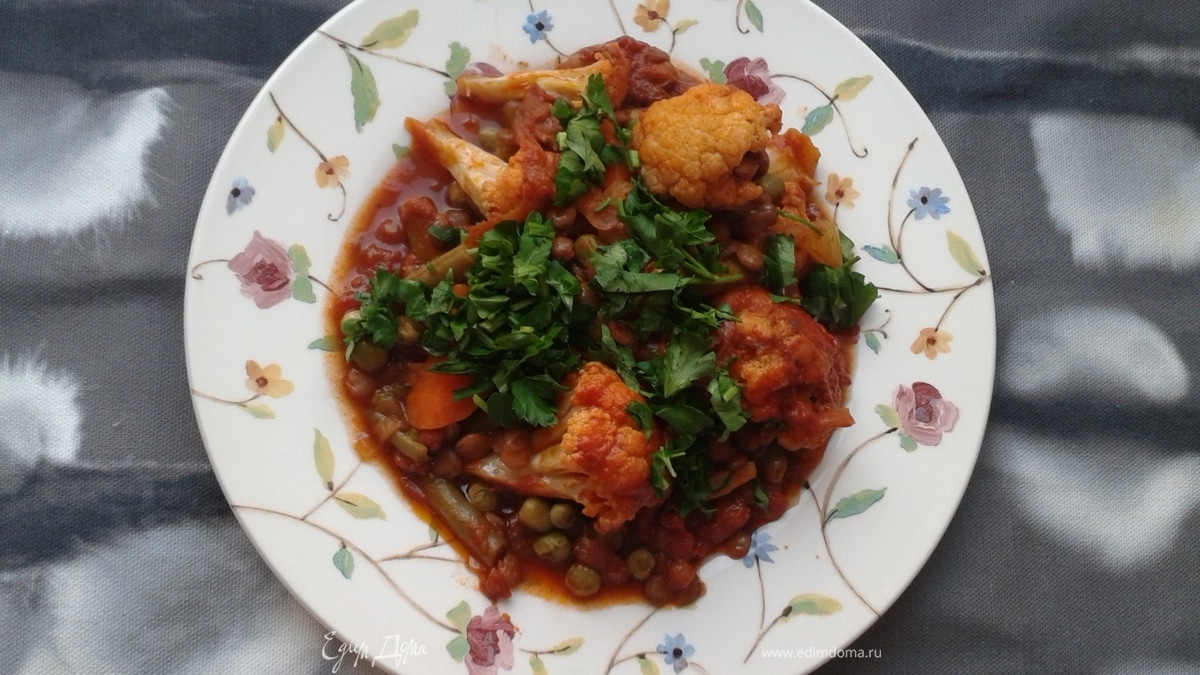 Цветная капуста зеленый горошек, стручковая фасоль и другие овощи, приготовленные с чечевицей. Насыщенный вкус овощей приправлены чесноком, красным перцем и паприкой.