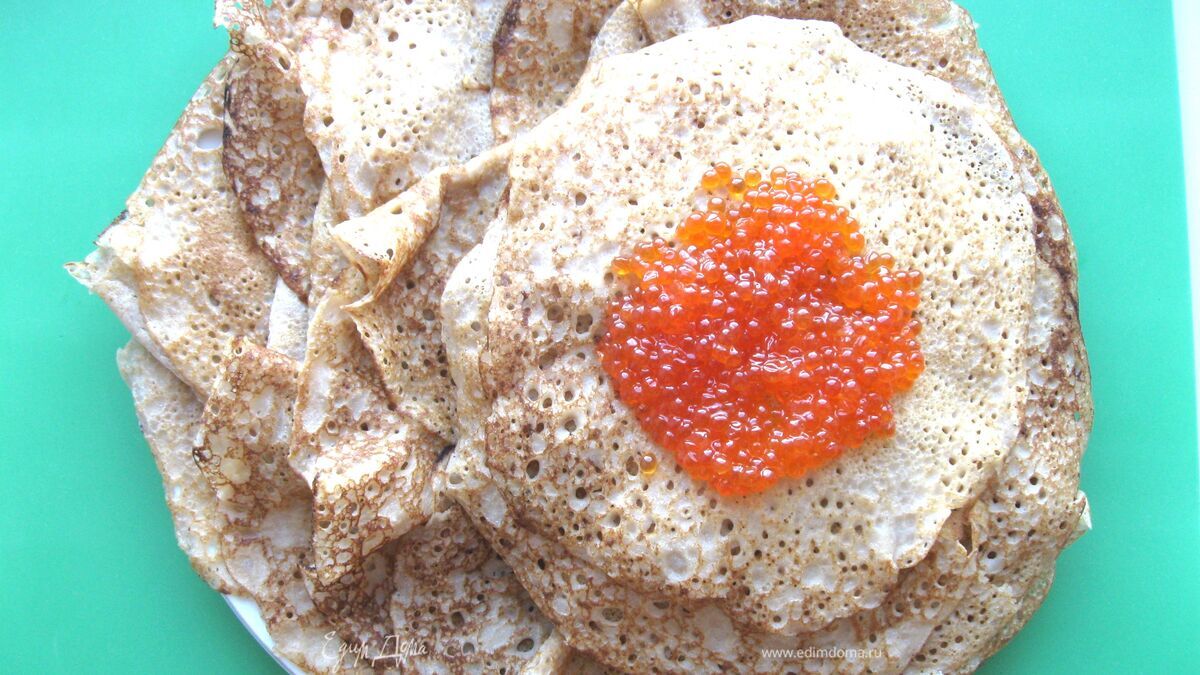 Сковородку, желательно чугунную, раскалить, смазать оливковым маслом и выпечь блины, аккуратно переворачивая их. Вот такие красавцы получатся у вас. Украсить блины икрой или подать отдельно. - Шаг 4