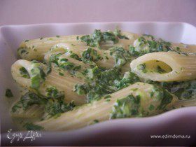 Сварить пасту до полутвердого состояния (аль денте) в большой кастрюле со слегка подсоленной кипящей водой. Затем слить воду, приправить пасту анчоусами и подрумяненными хлебными крошками, украсить перышками зеленого лука.