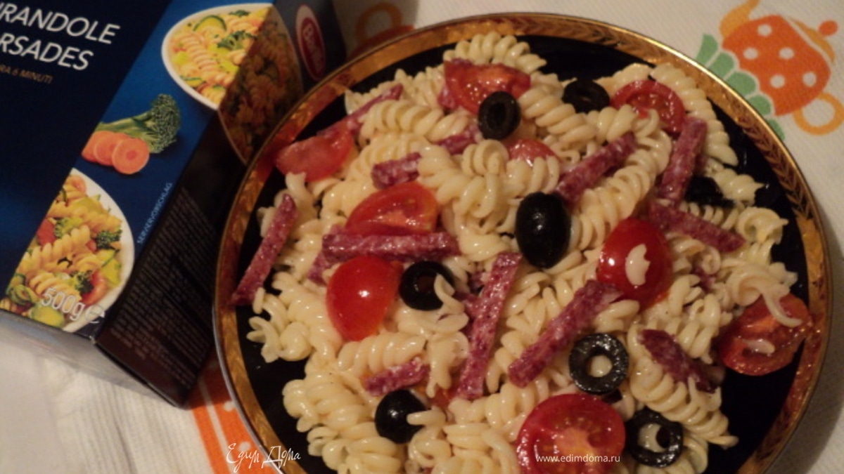 Добавьте оливки, кусочки колбасы и помидоры к макаронам, перемешайте. Сыр моцарелла натереть на терке. Посыпьте сыром Моцарелла и подавайте на стол.
