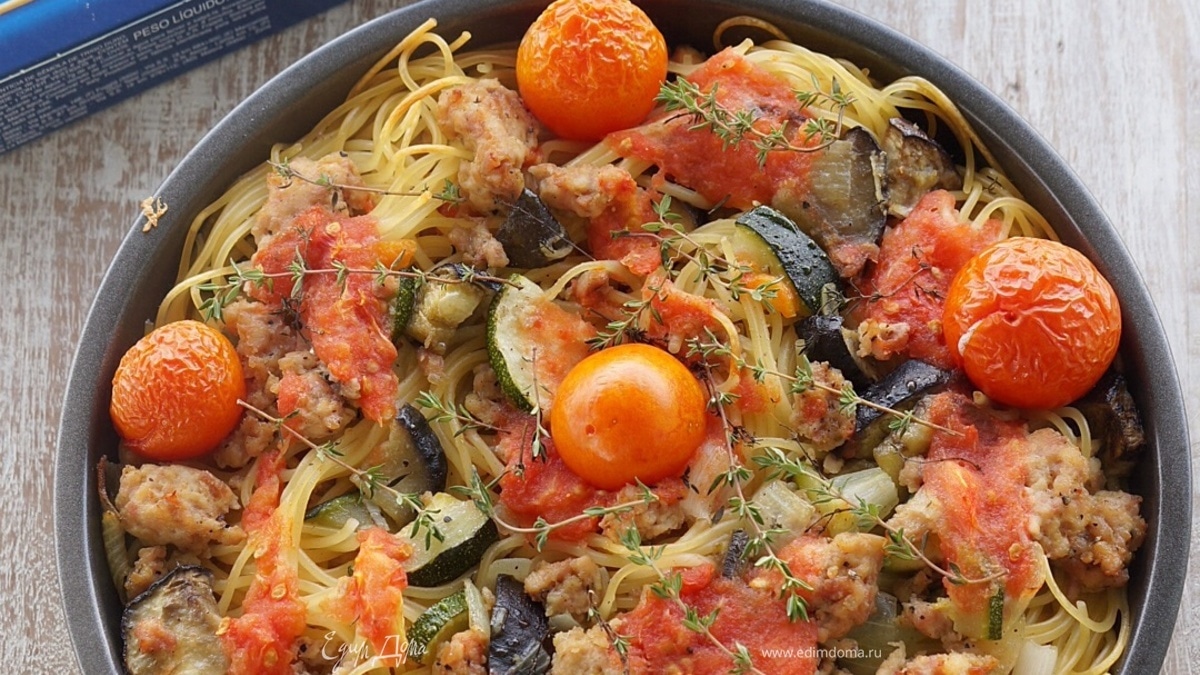 Спагетти, запеченные с овощами, куриным фаршем и томатами