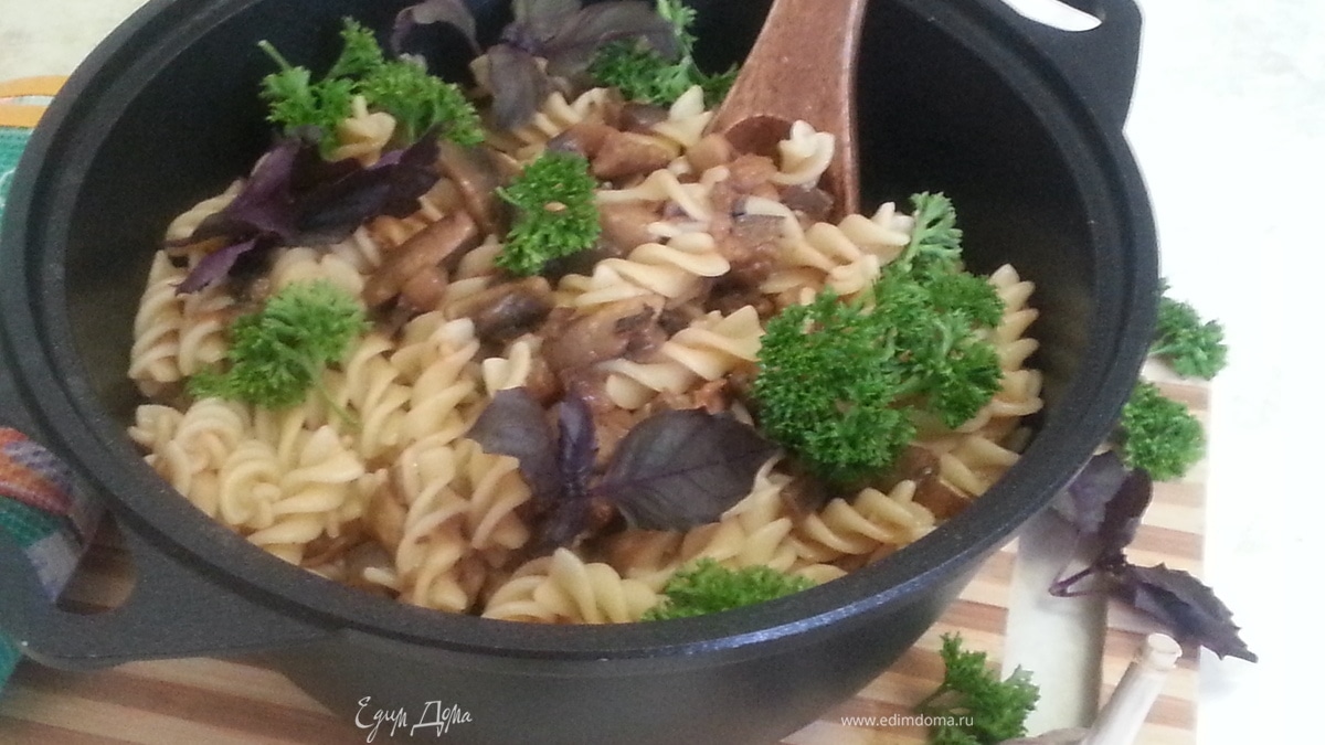 Отваренные фузилли добавляем к овощам, перемешиваем и сразу подаем на стол. Не забыв украсить свежей зеленью!