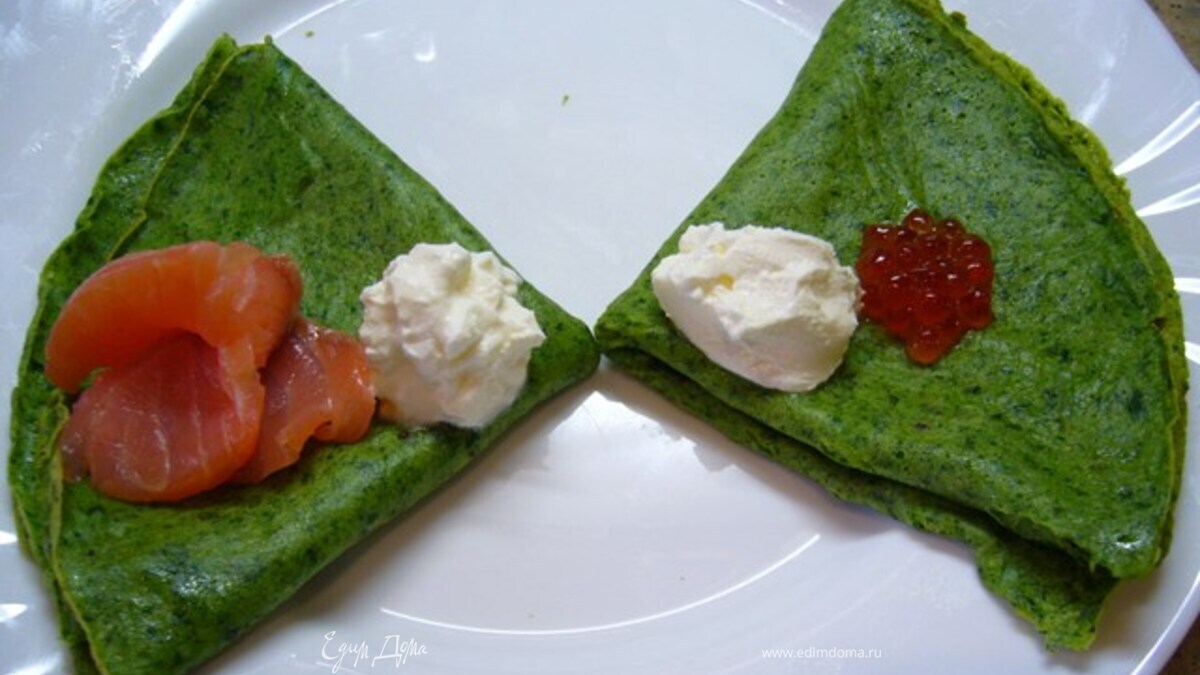 Прогреть сковородку, огонь уменьшить, влить тесто, распределить его по кругу (тесто довольно жидкое, текучее, нужно просто поворачивать сковородочку). Печь блины только с одной стороны, до полного пропекания. Поэтому блин с одной стороны остается гладким и зеленым. Очень вкусно со сметанкой, рыбкой, икорочкой!