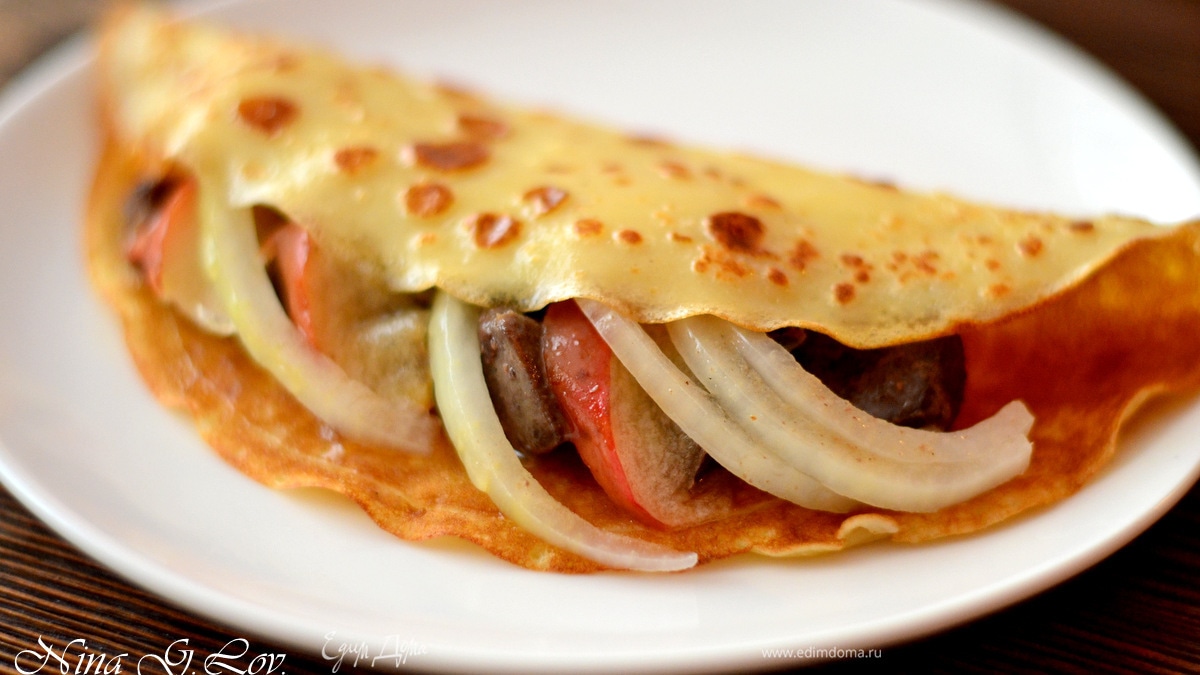 Блины с печенью, яблоком и маринованным луком
