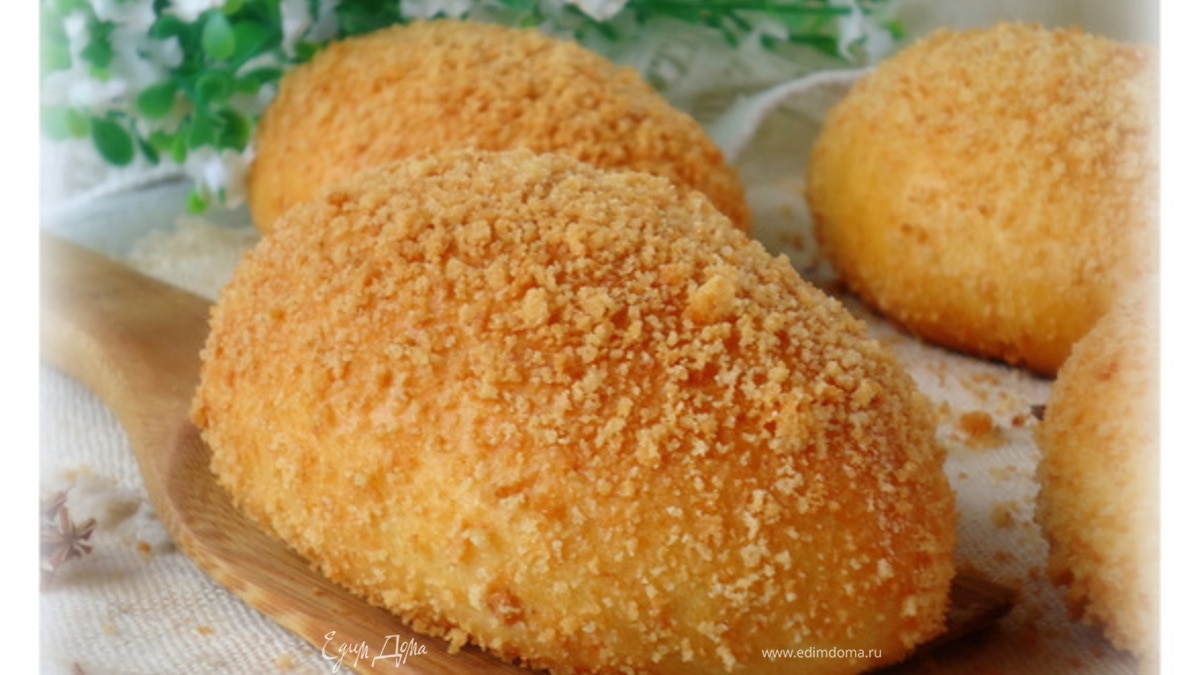 Уложить на противень смазанный маслом, дать время на подъем 20 минут, смазать желтком, разведенным с двумя ложками молока и обильно обсыпать бисквитной крошкой. - Шаг 10