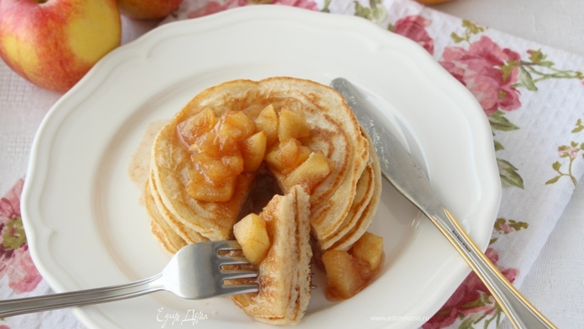Подать готовые панкейки стопочкой полив обильно яблочным топпингом. Приятного аппетита!