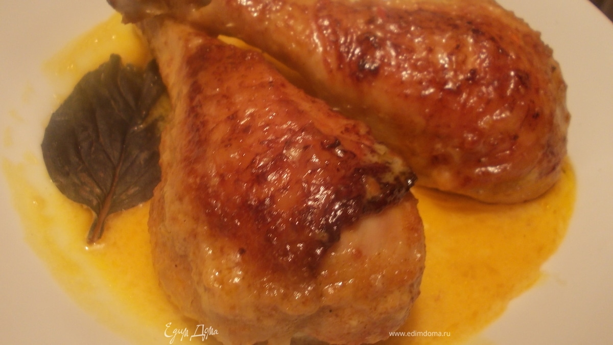 Выложить курицу в огнеупорную посуду смазанную оставшимся маслом. Отправить запекаться при 200С на пол часика, пока не появится золотистая корочка.