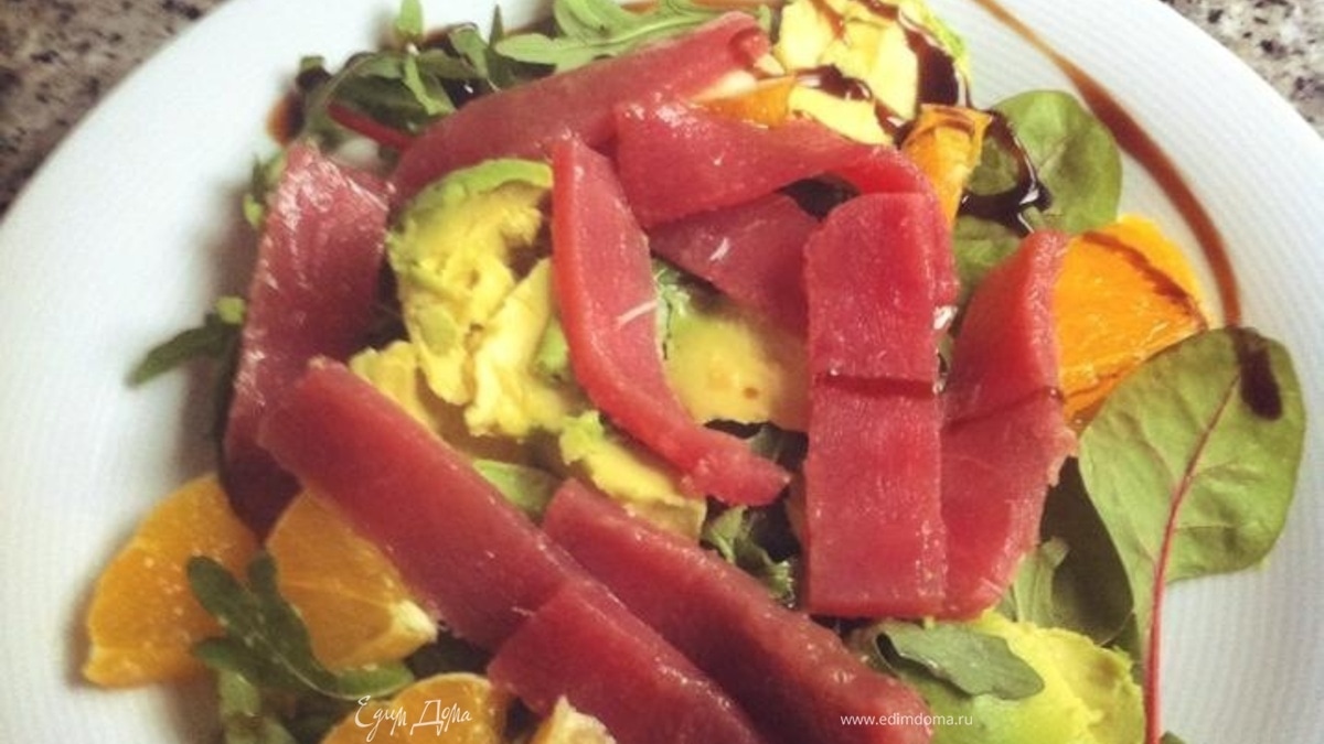 - Шаг 3Через 20 мин. достать охлажденного тунца и выложить в тарелочки с подготовленной подушкой из смешанных листочков, авокадо и апельсина. Оставшимся маринадом полить сверху... Можно присыпать свежем перцем.