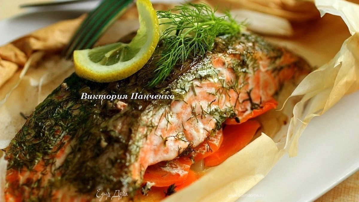Семга на подушке из фенхеля и моркови, запеченная в пергаменте