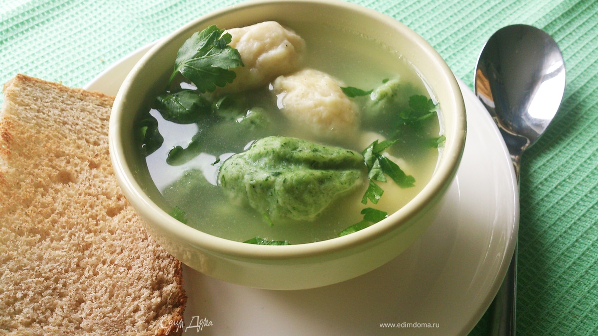 Готовый супчик разлить в тарелки и посыпать любой зеленью. Клецки из этого теста получаются необычайно нежные))