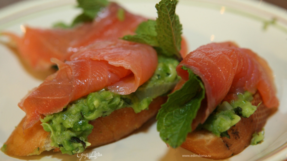 Гренки с зеленым горошком, семгой и мятой