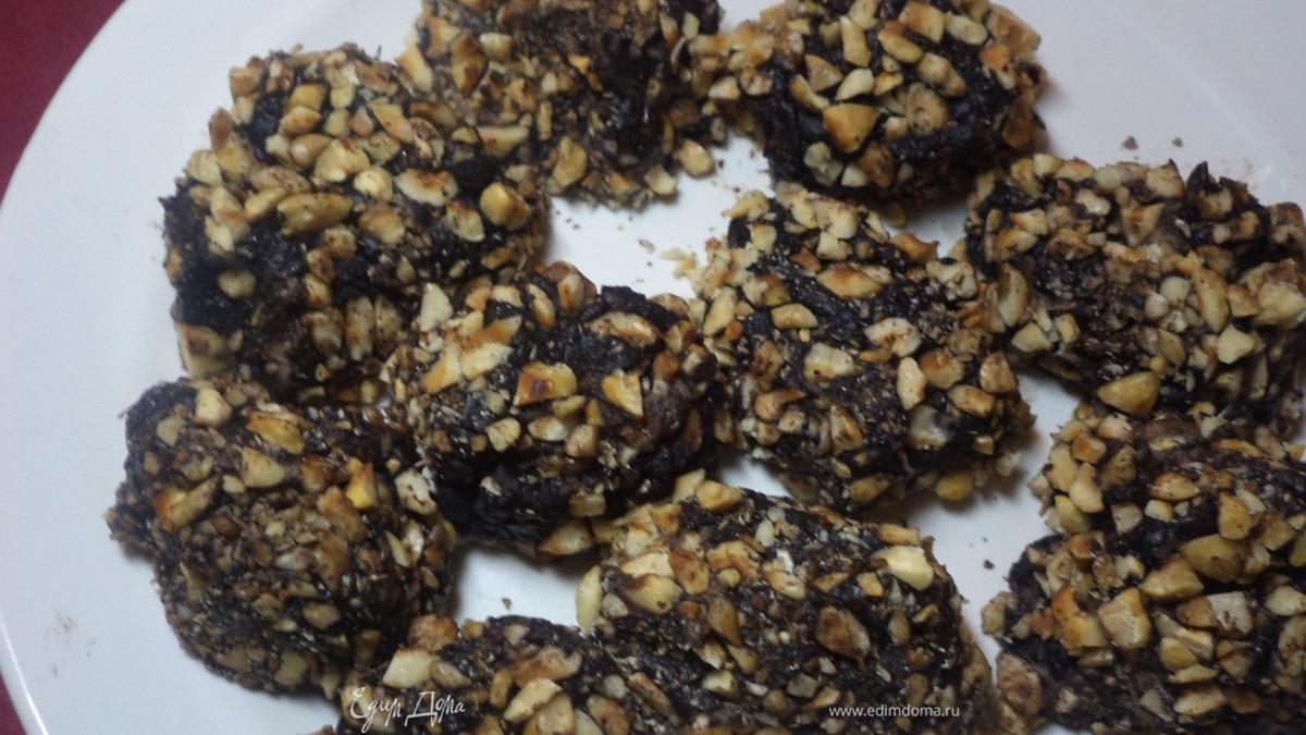 С помощью ложки, смоченной в холодной воде, сформировать из остывшей массы небольшие шарики. Обвалять шарики сначала в какао, затем - в рубленых орехах. На 2 - 3 часа убрать в холодильник.