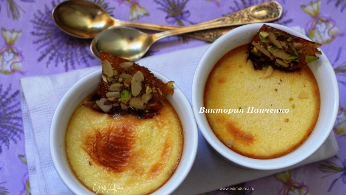 Разогреть духовку до 200 градусов. Поставить глубокие керамические формочки в глубокий противень. Наполнить формочки кремом. Аккуратно влить в противень горячую воду до 1/2 высоты формочек. Запекать 20-30 минут до загустения. Если верх сильно запечется, а крем еще будет жидким, затянуть формочки сверху фольгой и довести крем до готовности. Украсить грильяжем и подавать. Приятного аппетита!!!