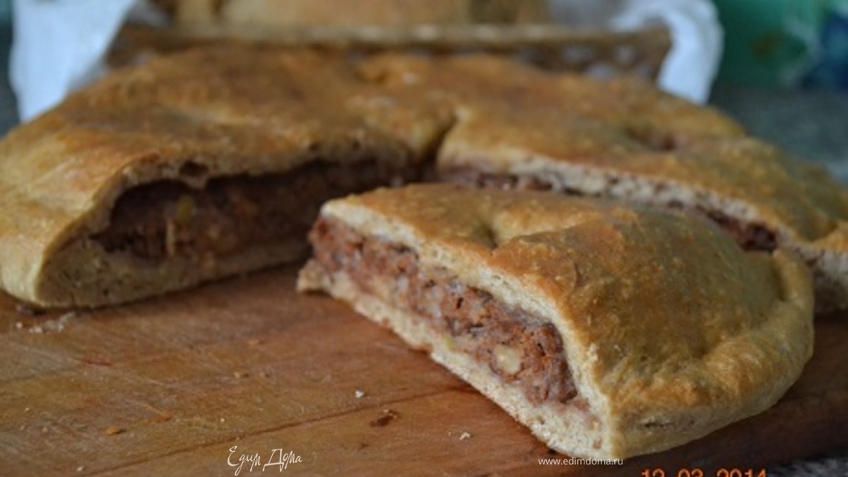 Очень вкусное сочетание мясного фарша со сладеньким изюмом. Яблочко дает сочность начинке, орехи приятно похрустывают и дают приятный аромат... А все это разнообразие запекается в ржаном тесте, что очень правильно!