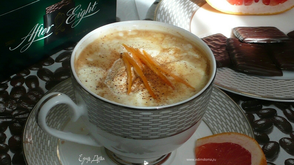 Кофе готовим в кофемашине, согласно вашей инструкции. Добавляем одну чайную ложку коричневого сахара и одну гвоздику, тертую цедру апельсина и немного рома. Сверху выложить взбитые сливки на кончике ножа молотый мускатный орех. - Шаг 2