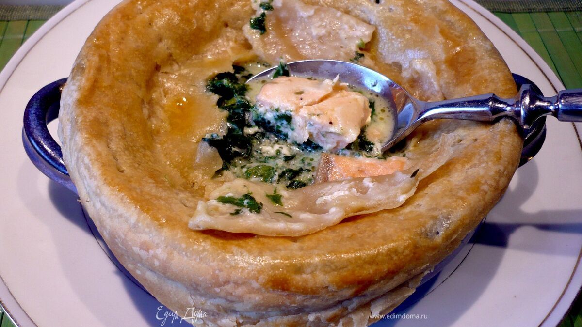 Похлебка с семгой и шпинатом под домашним слоеным тестом "очарована, околдована"
