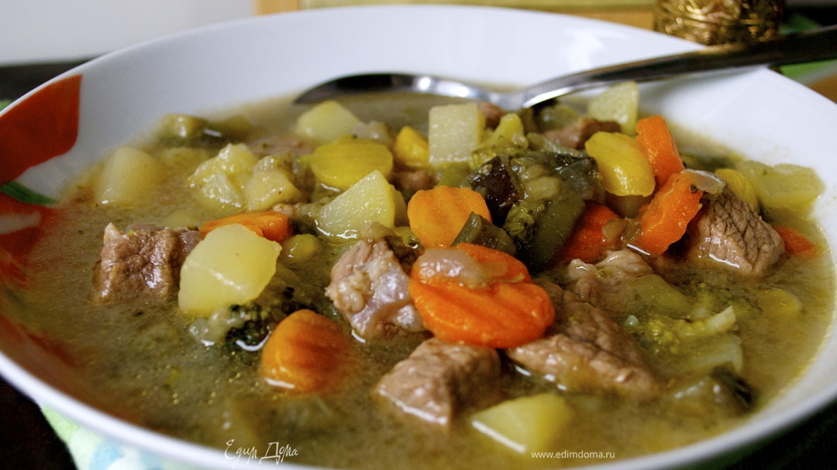 Как только мясо станет мягким, добавить в кастрюлю горячей воды (здесь лучше ориентироваться по Вашим предпочтениям - нравится Вам соус более жидким, или более густым...). Выложить подготовленную овощную смесь и баклажан... Проверить на соль. Проварить все еще минут 20 на небольшом огне. Выключить и дать настояться. - Шаг 7